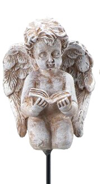 Gravpynt, Engel på stang, som holder en bok. Engelen er laget i hvi/brun polystone. Størrelse 5,5 x 2,5cm. Lengde med stang 25,5 cm.