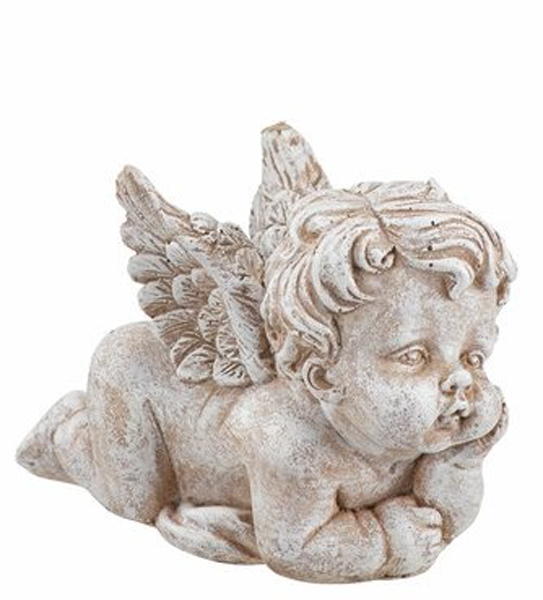 Gravpynt, liten engel, liggende på magen. Søt liten engel, laget i poleresin, med hodet på armen. Størrelse: 5,8 x 9,5 x 7 cm