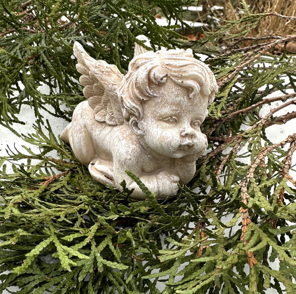 Gravpynt, liten engel, sittende med hodet på armene. Søt liten engel, laget...