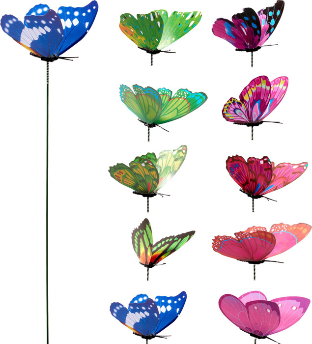 Pynt i hagen, på altan/terrasse i sommer med disse flotte sommerfugl blomsterpinnene. Stangen er i fargen grønn metall og sommerfuglene er laget i plast. Lengde 30 cm.