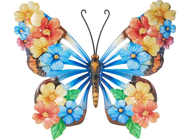 Vakker vegg Dekor, pyntet sommerfugl i metall, og med hovedfarge Blå. Størrelse 21 x 18 cm.